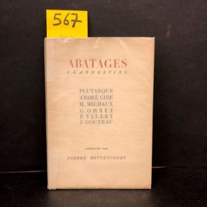 Abatages clandestins. Plutarque. André Gide. H. Michaux. G. Ohnet. J. Cocteau. Préfacés par Pierre Bettencourt. En France à l'intérieur des terres, [Saint-Maurice d'Etelan, Pierre Bettencourt], août 1943, 8°, 100 p., br., couv. rempl. (dos bruni). Edit. orig. tirée à 300 ex. sur Arches. 1/250 avec la couverture typographique.