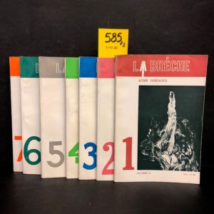 « La Brèche ». Action Surréaliste. Directeur : André Breton. P., Le Terrain Vague, Octobre 1961-Novembre 1965, 8 vol. grand 8°, br. Série complète des 8 numéros de la revue La Brèche, publiée sous la direction d'André Breton. Illustré par Jean Benoît, Jorge Camacho, Pierre Alechinsky, Asger Jorn, Jean-Claude Silbermann, Adrien Dax, René Magritte, Jindrich Styrsky... Contributions de Gérard Legrand, Jean Malrieu, Paul Nougé, André Breton, Malcolm de Chazal, Joyce Mansour, Gherasim Luca et beaucoup d'autres.