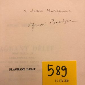 Flagrant délit. Rimbaud devant la conjuration de l'imposture et du truquage. P., Thésée, 1949, petit 4°, br., couverture illustrée de la reproduction de "La Guerre", seule lithographie réalisée par le douanier Rousseau (bords lég. frottés). Édit. orig. Tirage courant après 100 ex. num. sur vergé. Exemplaire enrichi d'un envoi à Jean Marcenac, écrivain, poète, journaliste et professeur de philosophie (1913-1984).