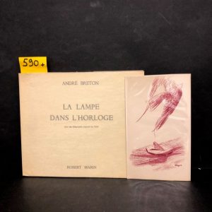 Tirage de tête.- BRETON (André). La Lampe dans l'horloge. Frontispice de Toyen. P., Robert Marin, « Collection l'Âge d'Or » dirigée par Henri Parisot, (1948), in-12 à très grandes marges, br. Exemplaire strictement tel que paru à toutes marges, couverture verte imprimée et illustrée d'une reproduction photographique en noir et blanc d'un collage de Toyen. Seconde couverture, à la taille des témoins, rempliée et non brochée, imprimée en noir sur vélin d'Arches. Edit. orig. rare. Tirage limité à 2350 exemplaires plus quelques exemplaires hors commerce. 1/250 ex. de tête (et non 350 comme indiqué à la justification), avec la lithographie originale de Toyen, tirée en sanguine sur Arches volant. Jugé défectueux par Breton, ce premier tirage fut détruit, sauf les 250 exemplaires du tirage de tête sur Arches, achevés d'imprimer à la même date, qui furent eux bien distribués. Il semble que ce soit l'oubli dans les exemplaires du service de presse de la photographie de l'auteur au château de La Coste qui a provoqué la décision de Breton de les faire pilonner.