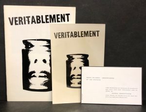Véritablement. Catalogue d'exposition. Brux., Palais des Beaux-Arts, du 13 au 25 avril 1967, plaquette 8° de 16 p., agrafé. Bien complet du feuillet de 4 pages reprenant la liste des 60 oeuvres exposées ainsi que du feuillet en annexe contenant le texte de J. Dypréau intitulé "Le Corbeau et le Renard" qui a été publié dans le journal "Beaux-Arts" du 15 avril 1967, donc 2 jours après l'ouverture de l'exposition. Mise en page par Corneille Hannoset. Très rare et bel exemplaire auquel on joint une photo d'époque de l'oeuvre qui a servi à la couverture dudit catalogue ainsi que la carte de marque de sympathie de la famille Broodthaers suite au décès de l'artiste.