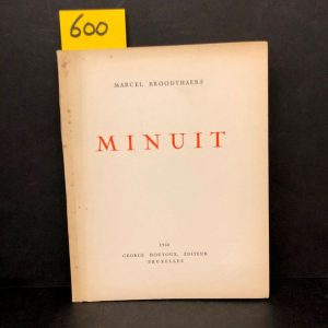 Minuit. Brux., Houyoux, 1960, 8°, 22 p., br., non coupé (bords lég. brunis, décharge sur la couv. avec qqs piqûres sur le bord gauche). Edition originale tirée à 225 ex. num. Ex. de chapelle sur papier vergé. Le frontispice annoncé dans la justification n'a jamais existé. Le titre "Minuit" imprimé en rouge sur la couverture n'est pas dédoublé.