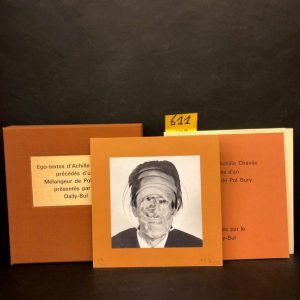 BURY.- CHAVEE (Achille). Ego-textes. Précédées d'un mélangeur de Pol Bury. La Louvière, Daily-Bul, 1967, 8° carré, en feuilles, couv. rempl., emboîtage toilé d'édit. avec pièce de titre. Edit. orig. tirée à 158 ex. num. 1/150 contenant 1 mélangeur de Pol Bury, justifié et signé au crayon par l'artiste. Choix de textes par A. Balthazar (96 poèmes et nombreux aphorismes écrits entre 1935 et 1965). Le mélangeur est constitué de douze portraits photographiques identiques superposés, dans lesquels des ouvertures circulaires concentriques de taille croissante sont ménagées ; les portraits ainsi découpés sont superposés et maintenus par un cadre en bois dans lequel ils sont libres de bouger, permettant de mélanger les différentes parties du visage. Bel exemplaire.