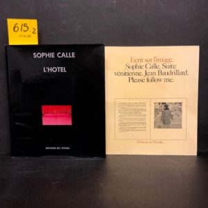 L'Hôtel. P., L'Etoile, 1984, 8° carré, br., jaq. (ancienne trace de mouillure au dos de la couv. et de la jaq.). Edit. orig. enrichie d'un envoi./ IDEM. Ecrit sur l'image. Sophie Calle. Suite vénitienne. Jean Baudrillard. Please Follow Me. Même édit., 1983, 8° carré, br. (couv. jaunie, pellicule altérée). Edit. orig./ Ens. 2 vol.