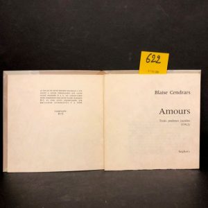 Amours. Trois poèmes inédits (1912). P., Seghers, 1961, plaquette 8° carré, non paginé, en feuilles, couv. impr. Edit. orig. tirée à 518 ex. num. 1/18 ex. de tête sur Japon nacré, et parmi ceux-ci un des six hors commerce.