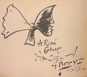 L'Effroi la joie. Saint-Paul, Au vent d'Arles, 1969, 8° oblong, 19 p., frontispice de Georges Braque reproduit par les ateliers Jacomet, br., couv. rempl. Edit. orig. tirée à 250 ex. num. sur papier à la cuve du Moulin Richard de Bas. 1/200 numérotés de 1 à 200, signés par l'auteur. Bel exemplaire.