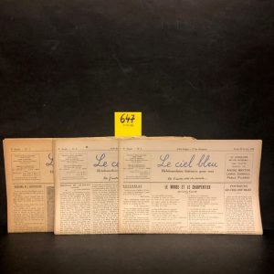 Hebdomadaire littéraire pour tous. Brux., du 22 février au 19 avril 1945, 9 fasc. de 37,5 x 27,5 cm, de 4 pages chacun (brunissure à 2 fascicules comme souvent, rares piqûres). Hebdomadaire dont la rédaction était assumée par Paul Colinet, Christian Dotremont et Marcel Mariën. Au sommaire : des poèmes, récits, essais, dessins et curiosités de Béalu, Breton, Broodthaers, Chavée, Dotremont, Dumont, Goemans, Irène Hamoir, M. Lecomte, Paul et René Magritte, Mariën, Permantier, M. et G. Piqueray, Scutenaire, A. Souris, R. Willems... Collection complète.