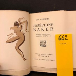 COLIN.- Les Mémoires de Joséphine Baker recueillis et adaptés par Marcel Sauvage. Avec 30 dessins inédits de Paul Colin. P., Kra, 1927, in-12 à grandes marges, br., couv. rempl. illustrée, non coupé. Edit. orig. tirée à 300 ex. num. sur pur fil Lafuma.