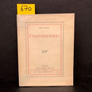 Êtes-vous fous ? P., NRF, 1929, 4° tellière, br., non coupé (dos bruni, petit pli angulaire à la couv.). Edit. orig. 1/109 ex. de tête réimposés sur papier vergé Lafuma-Navarre au filigrane NRF.