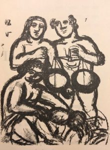 DERAIN.- VLAMINCK (Maurice). A la santé du corps. Poème décoré par monsieur André Derain (4 bois gravés hors texte en noir). P., Impr. Bernouard (étiquette de relais sur la couv. : éditions de la Galerie Simon, Paris), 1919, plaquette 4°, br., non coupé (dos lég. bruni, rares rouss. sur la couv., intérieur très frais). Edit. orig. tirée à 104 ex. num. 1/100 Arches, signé par l'artiste.