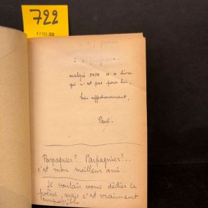 Les Nécessités de la vie et les conséquences des rêves, précédés d'exemple. Note de Jean Paulhan. P., Au Sans Pareil, 1921, 8°, br. (pli diagonal). Edit. orig. tirée à 635 ex. num. 1/600 vélin bouffant. Exemplaire enrichi d'un bel envoi à l'éditeur Aristide Jules Gonon (nom du dédicataire partiellement effacé) : "malgré DADA et ce livre / qui n'est pas pour lui / bien affectueusement / Paul" ; "Parpagnier ?.. Parpagnier?.. / C'est mon meilleur ami / Je voulais vous dédier ce / poème, mais c'est vraiment / impossible". Paru un an après la fondation de la revue "Proverbe", créée par Paul Eluard l'année même où Tristan Tzara débarquait à Paris, préfacé par Jean Paulhan dont l'auteur partageait alors les préoccupations sur le langage, ce recueil appartient à sa période dite Dada.