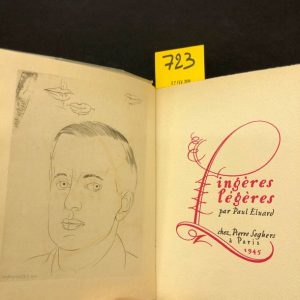 Lingères légères. P., Seghers, 1945, 8°, br., couv. rempl., non coupé. Portrait inédit de l'auteur par Marcoussis (eau-forte en frontispice, datée 1936 et signée dans la planche). Edition originale tirée à 685 ex. num. 1/35 ex. de tête sur vergé Montval. Exemplaire enrichi d'un envoi : "à Georges Spyridaki [écrivain et poète néo-helléniste] / ces avant-dernières délices / très affectueusemnt / Paul Eluard". Bel exemplaire.