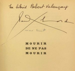 Mourir de ne pas mourir. Avec un portrait de l'auteur par Max Ernst. P., NRF, 1924, in-12, br., ex-libris ms. de Robert Valançay, auteur et traducteur français (1903-1984) (dos bruni comme souvent). Édit. orig. tirée à 545 ex. num. 1/535 vergé de Navarre. Exemplaire enrichi de la signature de Paul Eluard et Max Ernst.