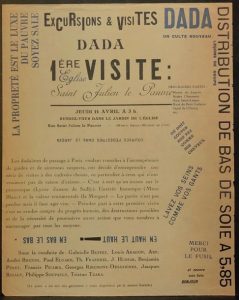 1ère visite. Eglise Saint Julien le Pauvre le jeudi 14 avril à 3 h. Tract publicitaire de 27,5 x 22 cm, imprimé en noir et bleu. Sous la conduite de Gabrielle Buffet, Louis Aragon, Arp, André Breton, Paul Eluard, Th. Fraenkel, J. Hussar, Benjamin Péret, Francis Picabia, Georges Ribemont-Dessaignes, Jacques Rigaut, Philippe Soupault, Tristan Tzara.
