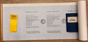 Recherche sur l'origine. Dusserdorf, Städtische Kunsthalle, 1974, 1 vol. in-12 et 1 rouleau de 9 mètres sur 30 cm, présenté dans une boîte de 10 x 32 x 9 cm. Edition originale tirée à 400 ex. num. et signés. Offset en noir sur rouleau de papier millimetré, enserré dans 2 tasseaux de bois rond (R. Filliou, Editions et multiples, Presses du réel, 57). Peu courant.