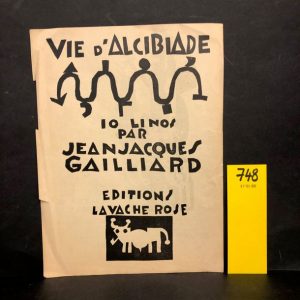 Feuillet d'annonce pour la "Vie d'Alcibiade", un ouvrage composé de 10 linos par Jean-Jacques Gailliard. Brux., La Vache rose, (ca 1924), 1 f. de 33 x 24,5 cm (petites déchirures marg.). Rare feuillet d'annonce illustré de linos de Gailliard et portant un épigraphe autographié de Marinetti imprimé en rouge.