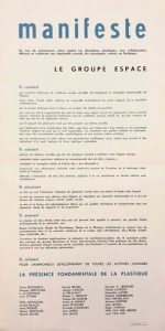 [Groupe Espace].- Manifeste "en vue de promouvoir entre toutes les disciplines plastiques, une collaboration efficace et conforme aux impératifs actuels, les soussignés, créent, en Belgique, Le Groupe Espace (...). Tract collectif signé par Victor Bourgeois, Willy Anthoons, Anne Bonnet, Gaston Bertrand, Jo Delahaut, Delevoy, Corneille Hannoset, Marc Mendelson, Antoine Mortier, Louis Van lint et bien d'autres. 1 feuillet imprimé en noir et bleu de 42 x 22 cm.