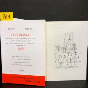HEROLD / CAMACHO.- AELBERTS (A.-V.) et AUQUIER (J.-J.). Cérémonial pour saluer d'éruption en éruption jusqu'à l'infracassable nuit la brèche absolue et la trajectoire du Marquis de Sade. Poème inédit de Gilbert Lely. Illustrations originales de Jorge Camacho et Jacques Hérold. Brux., Aelberts et Auquier, 1970, grand 8°, 65 p., en feuilles, couv. imprimée en rouge et noir, bande-annonce jointe. Edit. orig. tirée à 1075 ex. num. 1/54 Hollande, 3e papier après 5 Japon et 10 Auvergne, comportant 2 eaux-fortes originales, la première en couleurs de Jacques Hérold, la seconde en noir de Jorge Camacho (les 2 gravures sont signées au crayon).