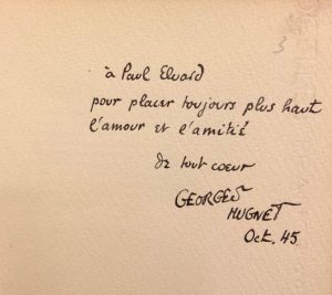 Le Buveur de Rosée. S.l., Fontaine, 1945, plaquette 8°, relié par un cordonnet. Tiré à part, extrait d'un recueil intitulé "Le Buveur de Rosée", publié aux éditions Pierre à Feu. Tirage limité à 35 ex. num. sur vélin Lana, signés par l'auteur. Exemplaire enrichi d'un envoi à Paul Eluard : "pour placer toujours plus haut / l'amour et l'amitié / de tout coeur / Georges / Hugnet / oct. 45". Rare et bel exemplaire.