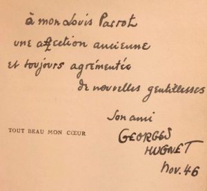 Tout beau mon coeur. P., Seghers, 1946, plaquette in-12, br., non coupé (couv. salie, dos bruni, 1 mors partiellement fendu). Edit. orig. 1/60 ex. de tête numerotés et signés par l'auteur. Exemplaire enrichi d'un envoi : "à mon Louis Parrot [poète, romancier, essayiste, journaliste et traducteur français, 1906-1948] / une affection ancienne / et toujours agrémentée / de nouvelles gentillesses / son ami / Georges / Hugnet / nov. 46". Enrichi également d'un tapuscrit de 16 pages (poèmes de Georges Hugnet sur papier brun numéroté de 00069 à 00084).