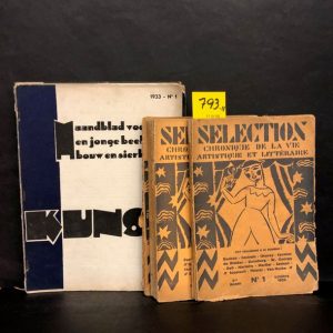 "Kunst". Maandblad voor oude en jonge kunst. N° 3, 4 et 10 (1931) et n° 1 (1933). Brux., 1931-33, 4 fasc. 4°, agrafé (1 dos abîmé). Comprend 1 bois de Jozef Cantré (planche volante)./ "Sélection". Chronique de la vie artistique et littéraire. N° 1, 3, 5, 8 et 9 (4e année). Brux., 1924-1925, 5 vol. 8°, br. (dos abîmés)./ Ens. 9 vol.