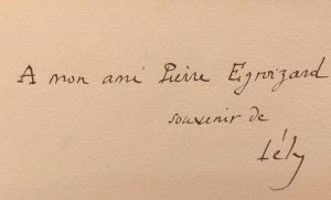 Ne tue ton père qu'à bon escient. Précédé d'une lettre d'André Suarès. P., La Centaine, 1932 (achevé d'imprimer : 1931), plaquette 8°, br., couv. rempl. Edit. orig. tirée à 204 ex. num. 1/200 vergé de Rives. Exemplaire enrichi d'un envoi : "A mon ami Pierre Egroizard / souvenir de / Lély". Bel exemplaire.