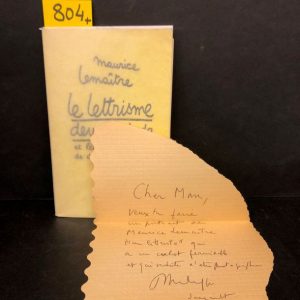 Le Lettrisme devant dada et les nécrophages de dada ! P., Centre de Créativité, 1967, 71 p., 8°, br. Edit. orig. tirée à 1050 ex. num. 1/1000 bouffant. Exemplaire enrichi d'un envoi à Man Ray : "l'un de ceux que / nous avons tant / défendus / Lemaître 67" ainsi que d'une lettre ms. de Philippe Soupault sur papier gaufré et festonné : "Cher Man [Ray] / Veux-tu faire / un portrait de / Maurice Lemaître / "un lettriste" qui a un culot formidable / et qui mérite à être photographier / Philippe / Soupault". On joint un tract du Front de la jeunesse lettrisme "Halte au gang des escrocs et des cuistres nécrophages de dada et pillards du lettrisme !".