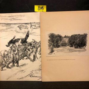 Suite de 6 lithographies en noir dont 4 hors texte à pleine page, publiées en 1909 dans la revue allemande "Kunst und Kunstler". Ces planches illustrent l'article de Karl Schieffer "Kunstgespräche im Kriege"./ IDEM. Gravure sur bois "nach einer kreidezeichnung von R. Hoberg" publiée dans la même revue en 1909. Dim. support : 31 x 23,5 cm ; sujet : 11 x 19 cm./ Ens. 7 pièces.