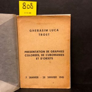 LUCA (Gherasim) et TROST (Dolfi). Présentation de graphies colorées, de cubomanies et d'objets. Exposition. Bucarest, Sala, Brezoianu, du 7 au 28 janvier 1945, plaquette 8°, agrafé (couv. lég. piquée). Edit. orig.