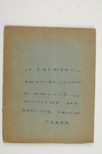 Tapuscrit (double carbone) de la première œuvre de Tzara, publiée à Munich en 1916 dans la « Collection Dada » de Julius Heuberger, avec des bois en couleur de Marcel Janco. Quelques corrections manuscrites au stylo bleu, et quelques légères marques au crayon en marge. Le tapuscrit est dans une chemise avec le titre manuscrit en lettres capitales : « la première aventure céleste de mr antipyrine par monsieur tristan tzara ».