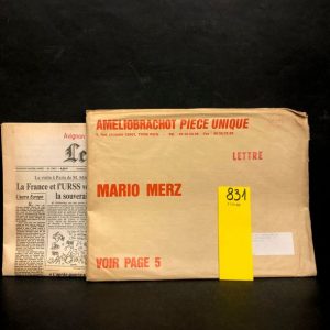 Mario Merz. Exposition. P., Ameliobrachot Pièce unique, 1989, in-folio, en feuilles, sous enveloppe éditeur tamponnée. "Carton d'invitation" sous la forme d'un exemplaire du journal "Le Monde", envoyé par la galerie, dans lequel se trouve l'annonce de l'exposition (p. 5).