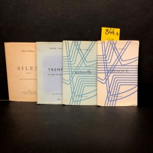 MOREAU (Franz). Ithaque. La Louvière, Montbliart, 1955, in-12, br. (traces de colle sur les contreplats). Edit. orig. tirée à 222 ex. num. 1/200 pur fil./ IDEM. Naturelle. Même édit., 1956, in-12, br. (traces de colle sur les contreplats). Edit. orig. tirée à 222 ex. num. 1/200 pur fil./ IDEM. Trempée. Un dessin de Janine Durant. La Louvière, La Main le Gant, 1958, in-12, br., jaq. Envoi sur la page de garde (couv. décolorée)./ IDEM. Silex. Poèmes. Avec un dessin de Armand Simon. Mons, Haute nuit, 1950, in-12, br. Edit. orig. tirée à 203 ex. num. 1/150 pur fil./ Ens. 4 vol.