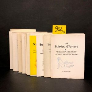 "Les Soirées d'Anvers". N° 1 à 12. Anvers, Ca ira, 1961- 1965, 12 vol. in-12, br., non coupé (piqûres éparses). Edit. orig. num. (tirage limité entre 105 et 200 ex.). On joint la maquette originale de la couverture du 3e numéro - ainsi qu'un tirage sur papier bleu - illustrée de la vignette dessinée par Floris Jespers. Joint également : le livre "Soirées d'Anvers. Notes et essais" par Paul Neuhuys avec une introduction par Henri-Floris Jespers (Pandora, Cahier 5, 1997, 8°, 268 p., br.)./ Ens. 13 vol.