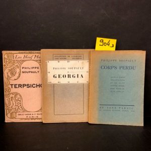 Corps perdu. Roman orné d'illustrations [in-texte] et de 2 pointes sèches hors texte de Jean Lurçat. P., Au Sans Pareil, 1926, in-12, br. (couv. décolorée comme souvent). Tirage limité à 900 ex. num. 1/800 vélin Montgolfier./ IDEM. Georgia. P., Cahiers libres, "Collection de l'Horloge", 1926, in-12, br., couv. rempl. (brunie). Edit. orig. tirée à 225 ex. num. 1/200 Hollande de Rives./ IDEM. Terpsichore. P., Hazan, "Les Neuf Muses", 1928, in-12, br., couv. rose illustrée, non coupé. Edit. orig. Ex. num. sur vergé bouffant./ Ens. 3 vol.