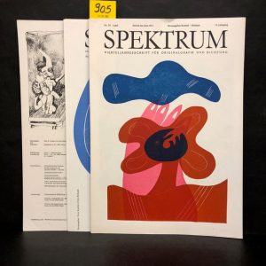 "Spektrum". Vierteljahresschrift für originalgrafik und dichtung. N° 55, 60, 70. Zurich, 1972-1976, 3 fasc. in-folio, en feuilles, couv. illustrée. Edit. orig. comprenant des estampes originales de Hans Bach, Carlos Duss, Wolfgang Häckel, Willi Keller, Magda Schneider, Emil Burki, et bien d'autres.