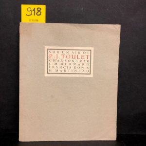 Sur un air. Chansons par Jean-Marc Bernard, Francis Eon et Henri Martineau. Brux., Un coup de dés..., 1927, plaquette 4°, br., couv. rempl. (lég. défraîchie). Edit. orig. tirée à 170 ex. num. 1/150 vélin Pannekoek.