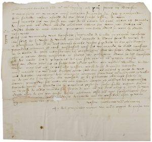 Lettre commerciale d’Anvers à Venise. Il lui adresse des vêtements de velours en raison de l’hoirie de Lorenzo Bembo son frère (que Dieu ait son âme). Il a fait tout ce qu’il a pu pour les vendre, mais sans en obtenir plus de 20 florins. Il évoque aussi des affaires avec le florentin Mauro Arrighetti, Rinaldo de Ricasoli, etc.