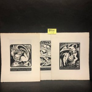 La Tentation de Saint Antoine. 1re partie. Huit planches. Anvers, Lumière, 1921, 4°, en feuilles, chemise à 1 rabat (couv. mauve abîmée partiellement cons. sans l'étiquette de titre, 1 lino manquant sur les 8 au total). Edit. orig. enrichie d'un envoi au poète Franz Buyle. Tirage limité à 220 ex. num. 1/10 ex. de tête sur vergé d'Arches, marqués de A à K. Tous les linos sont signés au crayon par l'artiste.