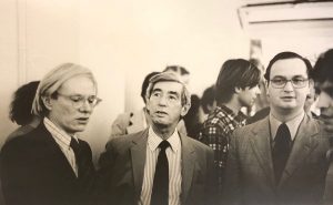 WARHOL.-MACHIELSEN (Erik). "Andy Warhol, Hergé et Guy Debruyne" (1977). Tirage argentique portant au dos le cachet de la Galerie D. Dim. : 17,5 x 24 cm./ IDEM. "Andy Warhol et Guy Debruyne sur le quai de la gare du Midi à Bruxelles" (1977). Tirage argentique portant au dos le cachet de la Galerie D. Dim. : 17,5 x 24 cm. La Galerie D, dirigée par Guy Debruyne dans les années 70, est considérée comme une "succursale" belge de la galerie Sonnabend. Debruyne a notamment exposé Rauschenberg, Warhol, Jasper Johns, Carl André, etc. A la fin des années 70, Warhol vint à Bruxelles pour faire le portrait d'Hergé, un habitué de la Galerie D./ Ens. 2 pièces.