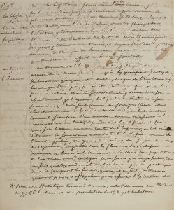 Campagne de Russie. Fragment du manuscrit original corrigé des Souvenirs militaires publiés par le fils du général en 1855 (J. Dumaine, 2 vol.). Ce cahier « 9e » correspond au texte remanié des pages 67-95 du tome II. Il traite de deux épisodes de la Campagne de Russie de 1812 : l’entrée des Français dans Moscou (causes et conséquences de l’incendie de la ville, pillages, responsabilité de Rostopchine, contre-vérités qu’on a propagées, ouvertures de paix faites par Napoléon), puis la bataille de Polotsk des 18 et 19 octobre (offensive de Wittgenstein et Steingel, blessure de Saint-Cyr, commandement passé à Merle, paralysie de la division Grandjean). Berthezène voit dans ce combat un épisode fatal pour la campagne : « je demanderai […] si un général aussi expérimenté que Macdonald, n’auroit pas dû interpréter les intentions de Nap. qui ne pouvoient être douteuses dans cette circonstance ; s’il ne devoit pas venir au secours de cette position de l’armée prête à succomber sous des forces si supérieures […], la Division Loison étoit à Wilna et le 9e corps à Smolensk. Ces deux points n’étoient point menacés et pouvoient être découverts sans danger ; on auroit donc pû et dû employer contre Wittgenstein et faire agir ainsi contre lui au moins 40,000 hommes de plus. Avec de telles forces, non seulement on eut fait échouer tous les projets de ce général, mais on l’eût écrasé lui-même et tout étoit sauvé. […] Cet éparpillement de nos forces au moment où elles auroient dû être concentrées ; leur inaction, quand elles devoient frapper de grands coups, étoient bien un malheur attaché à l’éloignement de Napoléon »…