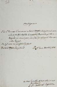 « J’ai l’honneur d’annoncer à votre Altesse Sérénissime, que, à la suite des ordres de Sa majesté Impériale, qu’elle a daignée me communiquer, mon coursier est parti hier soir à dix heures »…