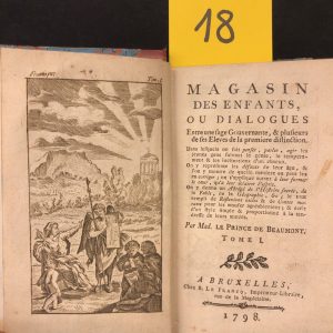 LE PRINCE DE BEAUMONT (Mme). — Magasin des enfants, ou Dialogues entre une sage gouvernante, et plusieurs de ses élèves de la première distinction (...). — A Bruxelles, chez B. Le Francq, 1798, 2 tomes reliés en 1 vol. in-12, frontispice et 4...
