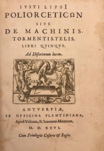 Édit. orig. Les gravures sont attribuées à Pierre Van der Borcht (Funck, 354). L’ouvrage est une suite de dialogues prétendument tenus à Liège entre Juste Lipse, Jean Furius archiprêtre, Jacques Carondelet, chancelier, Pierre Oranus ou d’Heur, jurisconsulte et conseiller du prince-évêque de Liège et Dominique Lampsonius. On y relève plusieurs notes intéressantes sur les amitiés liégeoises de Lipse. Un dialogue est consacré à l’origine du nom de Liège. La conversation tombe sur la récente prise de Deventer, ce qui amène à parler des machines de guerre qui est le véritable sujet du livre. Le prince-évêque de Liège, à qui l’ouvrage est dédicacé, récompensa l’auteur par l’envoi d’un collier en or, avec son portrait en médaille.