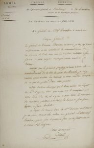 Claude-Sylvestre COLAUD (1754-1819) général. L.A.S., Q.G. de Strasbourg 21 brumaire VIII (12 novembre 1799), au général en chef Lecourbe à Mannheim ; 1 page in-fol. à son en-tête.