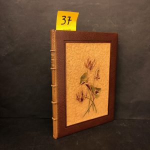 plein maroquin brun, dos à 5 nerfs, auteur, titre et daté dorés, premier plat décoré d’une pièce en cuir repoussé, travaillé à froid, représentant un bouquet de cyclamens polychrome, double filet sur les coupes et les coiffes, contreplats bordés de même et doublé de maroquin vert, 5 filets dorés d’encadrement avec fleuron dangle, double garde en soie brodée de fleurs et papier marbré, tranches dorées sur témoins, couv. cons., étui (frotté), ex-libris AML [Anne-Marie Laurent] (reliure signée Noulhac). Édition illustrée de 11 eaux-fortes en couleurs, dont la couverture, le titre orné, 2 en-têtes, 2 culs-de-lampe, les faux-titres et 3 hors-texte, par André-Charles Coppier. Le texte est orné d'encadrements floraux gravés sur bois et coloriés à la main. Tirage à 115 exemplaires sur Arches, dont 100 mis dans le commerce et souscrits par A. Durel, libraire. Celui-ci un des 75 avec les tirages successifs d'une seule eau-forte. Prospectus joint. Très bel exemplaire.