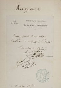 P.S. par le général Henry, Paris 21 mars 1871 (cachet encre), laissez-passer pour un matelot se rendant à Brest. {CR} L.S. par le colonel A. Thomas, commandant le 85e régiment de marche, Camp de Vaucresson 8 avril 1871, au colonel Loysillon, relatant la prise du pont de Neuilly défendu par les insurgés.{CR} P.S. par le général de brigade Osmont, Sceaux le 16 mai 1871, rapport sur les événements militaires des 15 et 16 mai au sud de Paris.{CR} L.A.S. par Grelier, membre du Comité Central de la Garde Nationale, au général Chanzy, le priant d’intervenir pour obtenir sa libération...{CR} 2 gravures en couleurs par Paul Klenck, caricatures d’une pétroleuse et d’un pétroleur.
