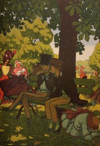 Reliure de Sauer.- BRISSAUD.- FRANCE (Anatole). — La Vie en fleur. — Avec des gravures en couleurs de Pierre Brissaud. — P., Devambez, 1924, petit 4°, demi-maroquin rouge à coins, dos à 5 nerfs ornés de pointillés dorés, caissons dorés...