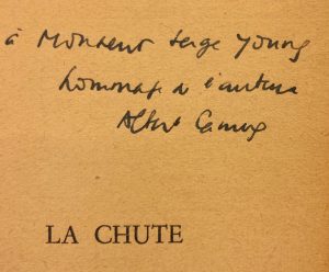 CAMUS (Albert). — La Chute. — P., NRF, 1956 (achevé d'imprimer : mai 1956), in-12, br. (ex. gauchi, couv. salie, micro-manque en queue de dos).