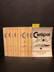 "CRITIQUE 38". — Revue mensuelle d'informations littéraires et de critique. — Paris, du n° 1 (mai 1938) au n° 15 et dernier (juillet 1939), br., couv. ill. (le n° 1 en photocopie). — Revue dirigée par Max Delatte avec des contributions de...