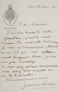 Baron Beyens, Georges Bibesco, Victor du Bled, Gaston Boissier, Roland Bonaparte, Henri de Bornier (4), Albert de Broglie, François Coppée, Ernest Daudet, Paul Deschanel, Camille Doucet, Édouard Drumont, José Maria de Heredia, Henry Houssaye, Mgr d’Hulst, E. Jurien de la Gravière, Socrate Lagoudaky, cardinal Langénieux (3), Hippolyte Larrey, J. Lemire, Lemyre de Villers, Stéphen Liégeard, Alfred Mézières, Albert de Mun, Frédéric Passy, Jacques Piou, Edmond Rousse (4), Jules Simon, P. Thureau-Dangin, G. Vapereau, Marcel Vilbert (7 intéressantes lettres de Péra, 1893-1894, sur Constantinople), Henri Wallon (4), etc. Plus qqs cartes de visite.